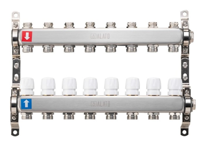 Коллектор ALATO с запорными вентилями, обратный с отсечными клапанами, 2 кронштейна 1"x3/4"x8-вых