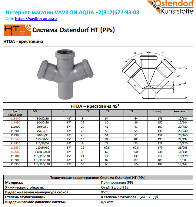 Крестовина 110 "OSTENDORF" для внутренних систем канализации используется для монтажа двух ответвлений от основных канализационных стояков в одной плоскости, транспортирующих стоки внутри зданий.