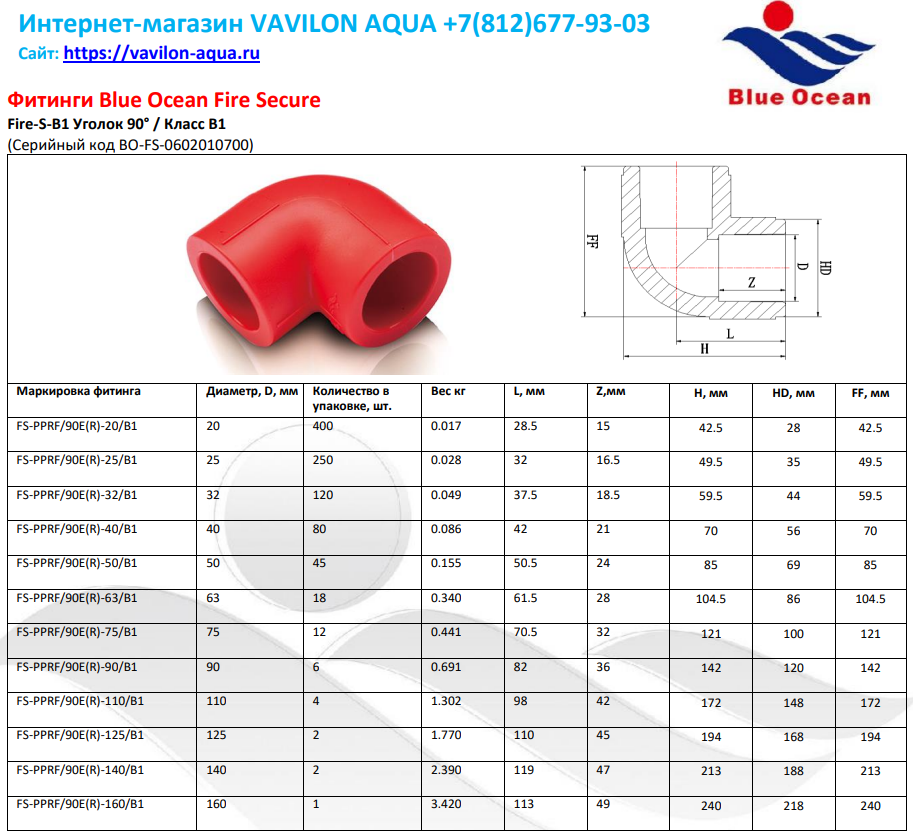 Уголок противопожарный из огнестойкого полипропилена 63 Blue Ocean - фитинг, использующиеся для поворота системы водоснабжения на 90°.